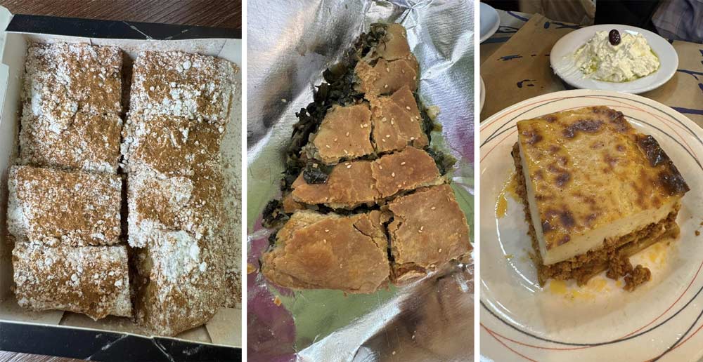 בה אכלנו מגוון מנות מה״חומוס״ היווני העשוי בכלל מאפונה צהובה ונקרא פאבה, דרך סלט עשבים , גבינת פטה אפויה טבולה בדבש וקרוקטים עם קישואים ויוגורט, משם המשכנו למאפיה הידועה במאפה התרד שלה ובעוגיות קטלניות, בהמשך ביקרנו בשוק המרכזי של אתונה